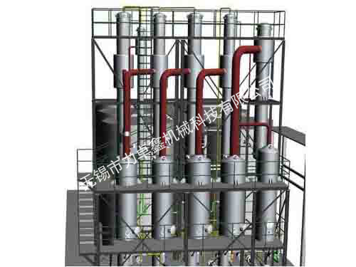 工作原理:四效降膜蒸發(fā)器需濃縮的料液由泵送入加熱管頂部,沿著加熱管內(nèi)壁形成液膜向下流動(dòng)。在這個(gè)過(guò)程中,由于管外的加熱,管內(nèi)液膜開始沸騰并部分蒸發(fā)